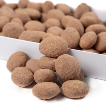 de 9 bombones o trufas con 2 separadores de orangettes o gajos de naranja o rocas, o bombones simfonia o catanias.