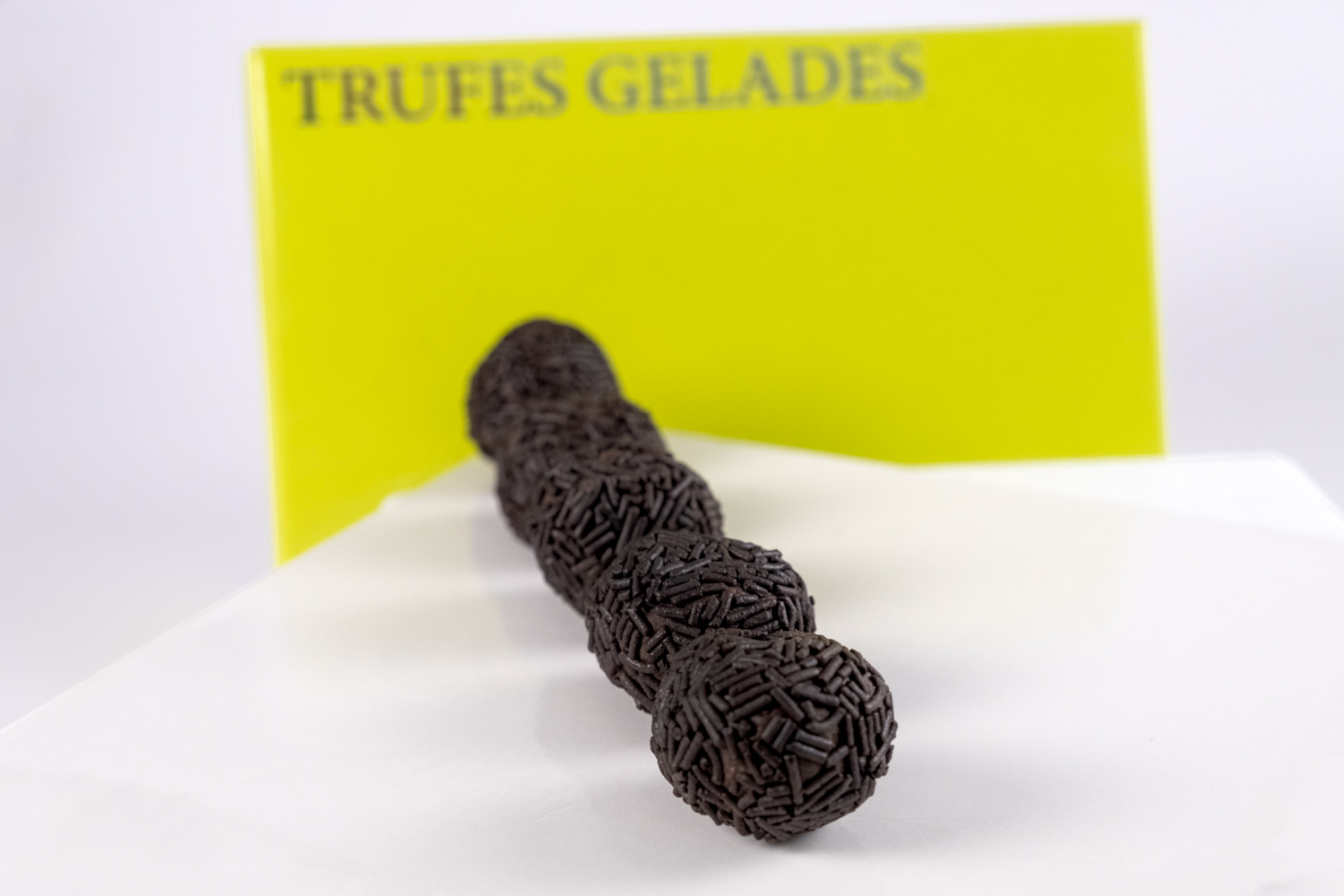 Trufas de chocolate negro de textura cremosa, ligeramente rebozadas con viruta de chocolate.